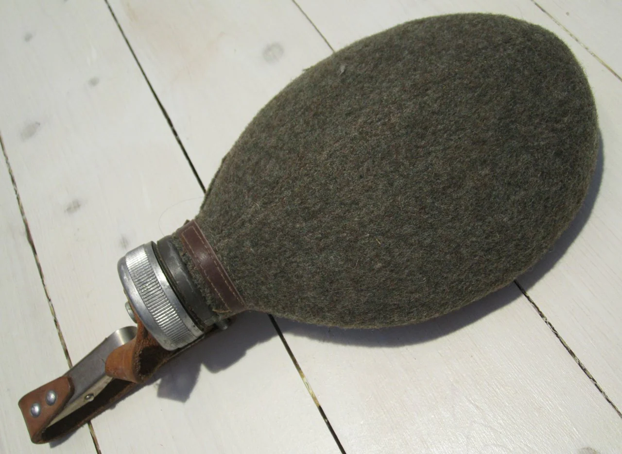 Dricksflaska i aluminium med yllefodral m/1929 m/1939 (kan förekomma både med eller utan läderband upptill).